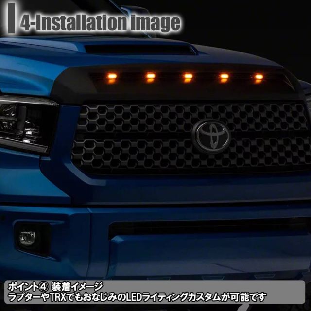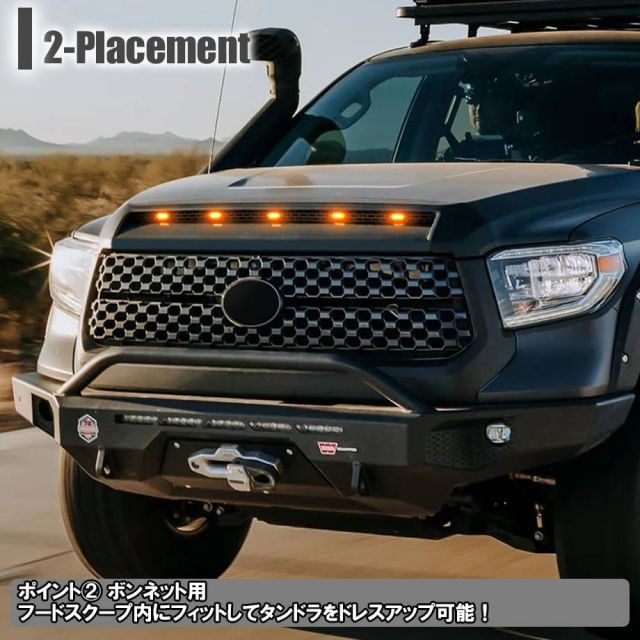 タンドラ用のボンネットスクープ用LEDマーカーライトです。 アメリカンカスタムといえば、オフロードライトやルーフマーカーがおすすめですが、こちらは最も人気のあるアンバー点灯で、夜間の存在感を倍増させることが可能です。 純正ボンネットフードの僅かな隙間を鮮やかに簡単カスタム!お取り付け方法は純正の部品をそのまま流用して頂き使用するのみの固定、配線接続等は別途行って頂く必要がございます。 |