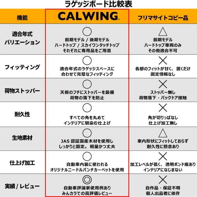 フリマサイトのコピー品にご注意ください 当店オリジナルのラゲッジボードですが、フリマサイト等でコピー品を見かけることがあります。当店の商品と比較し、細部の造りこみや処理が甘く、使用素材も安価なものが多いです。また、適合も不明確であり、買っても使用できない可能性があります。その他にも、便利なカップホルダーや荷物のストッパー等のプラスの機能が無い商品がほとんどです。 |