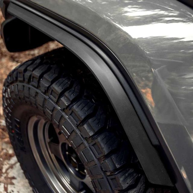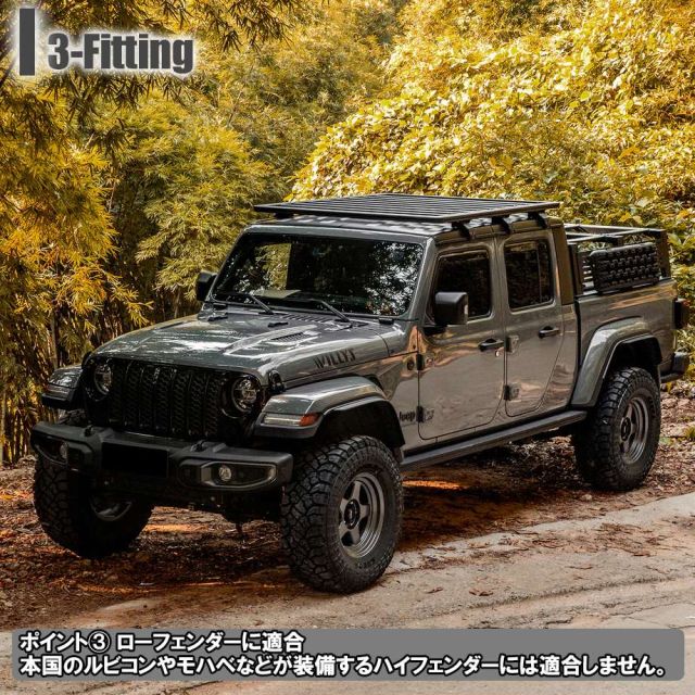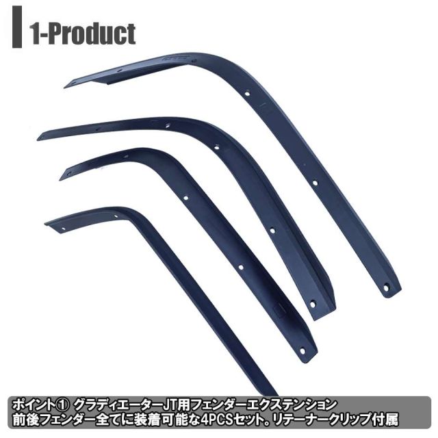 カリフォルニアマッドスターからリリースされた、グラディエーターJTのローフェンダータイプ用フェンダーエクステンショントリムをご紹介します。 純正フェンダーからどうしてもタイヤがはみ出してしまう場合などにもオススメです。 装着は付属のリテーナークリップを使用して取り付ける為、加工の必要はありません。カラーも純正フェンダーと同じブラックの樹脂となりますので違和感なくフィットします。 前後左右4PCSセット。グラディエーターJTの本国仕様ハイフェンダー車両には適合しませんので、ご注意ください。 |