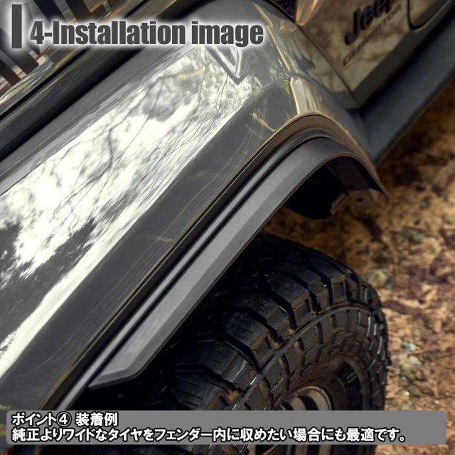 ・素材:樹脂製 ・4PCSセット ・付属のリテーナークリップを使用して装着する為、加工の必要はありません。 ※ご注意:純正ローフェンダー車両のみに適合します。本国仕様ハイフェンダーには適合しませんのでご注意ください。 |
