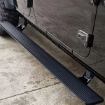 カリフォルニアマッドスターからリリースされたラングラーJK用電動サイドステップ(パワーランニングボード)のご紹介です。 リフトアップした車両はサイドステップがあると乗り降りが楽になりますが、純正は形状がスタイリッシュとは言えず、カスタムしたくなるポイントです。 こちらはドアの開閉に合わせてステップが昇降する電動サイドステップとなっており、使用しない時はボディに沿って格納される為、非常にスタイリッシュとなっています。 ドアを開くとステップが降りてくるので女性やお子様でも、乗り降りがしやすくなります。リフトアップした車両はもちろん、純正車高のJKにもオススメです。 本体はブラックパウダーコートが施されており、耐久性が高く長く使って頂ける製品です。 |